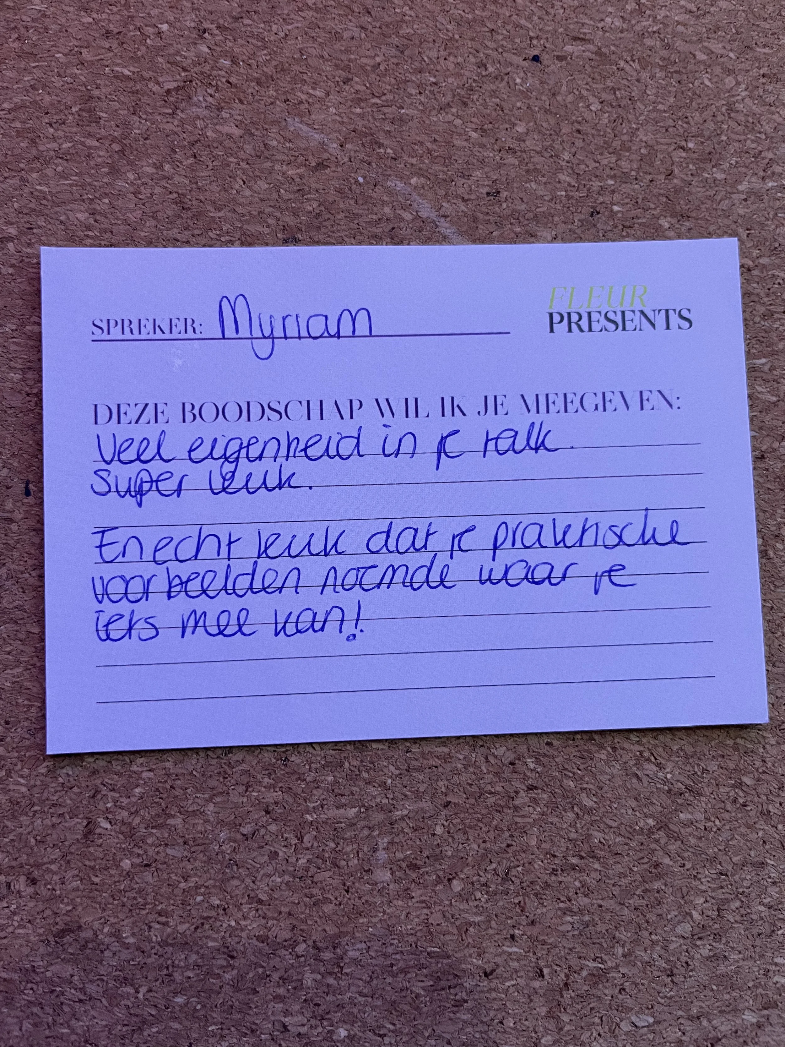 “Veel eigenheid in je talk, super leuk! En echt leuk dat je praktische voorbeelden noemde waar je iets mee kan!”