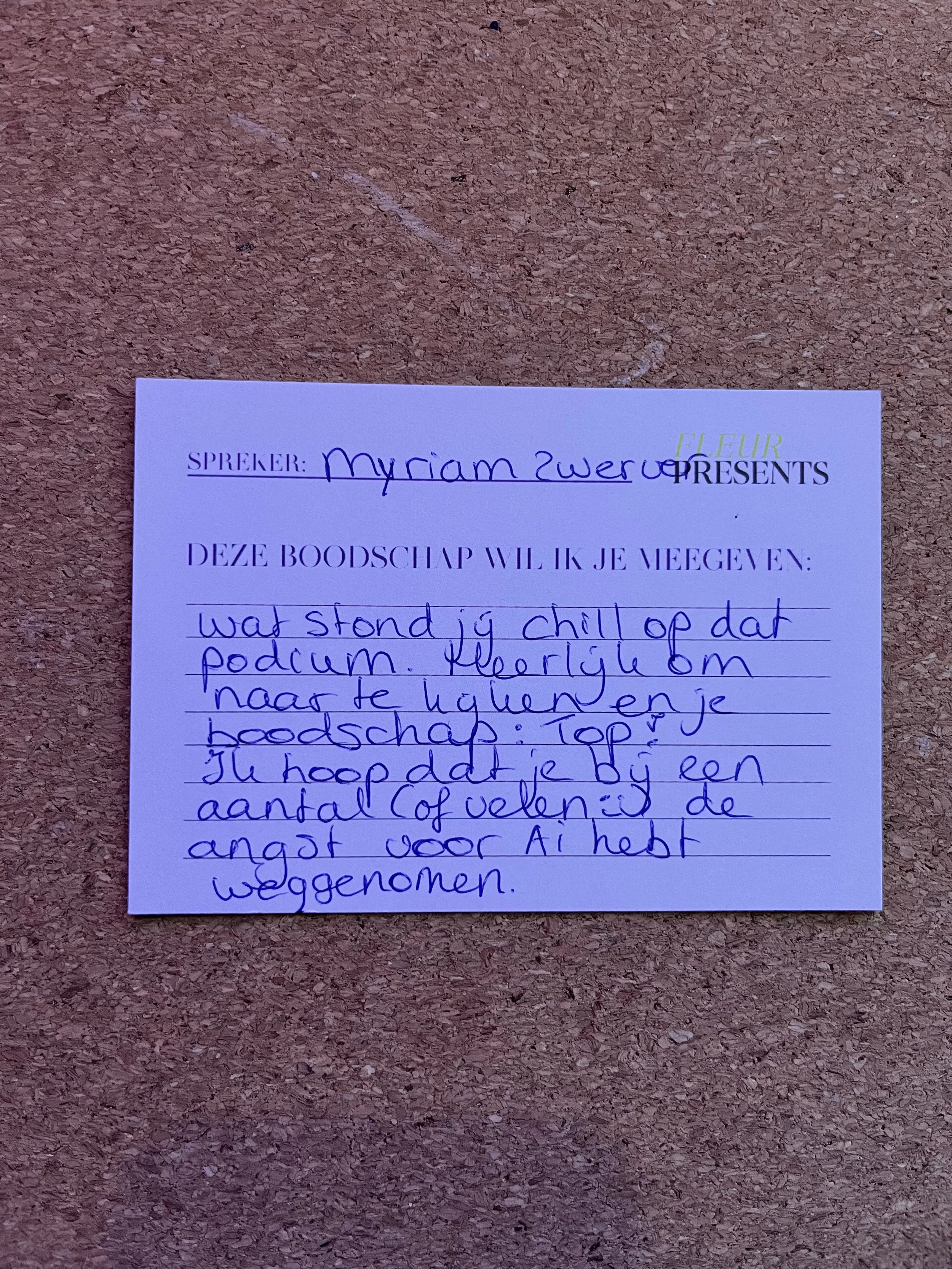 “Wat stond jij chill op dat podium. Heerlijk om naar je te kijken en je boodschap is top! Ik hoop dat je bij een aantal (of velen :-)) de angst voor AI hebt weggenomen.